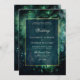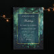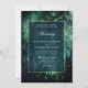 Une aquarelle fantaisie illustrant le feuillage luxuriant en vert émeraude, pétillant de lumières féériques et de poussière magique, décore cette invitation mariage de automne du printemps avec un thème forestier enchanté. Il présente également un cadre faux or brossé à la main et un revêtement bleu marine foncé transparent, qui donne l'atmosphère pour une soirée enchanteresse et une nuit magique. Une invitation élégante et moderne à un mariage de conte de fées. Parfait pour les épouses qui aiment le cadre de la forêt de contes de fées, la forêt de fées ou le thème de jardin de fées et vert émeraude, marine et or.