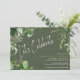 Invitations décontractées à la fête d'anniversaire avec plantes tropicaux aquarelle sur un arrière - plan vert foncé. Texte "Fêtons" dans une police de script avec les détails de votre événement dans le coin inférieur droit. Peut être changé à n'importe quel âge.