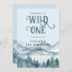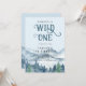 Rustique aquarelle forêt "sauvage un" thème 1er anniversaire invitation à la fête avec montagnes et arbres dans les teintes de bleu et vert.