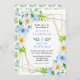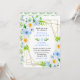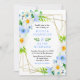 This fun and whimsical wedding invitation features watercolor blue forget me nots, daisies and foliage on a gold geometric frame. The text combines handwritten script and serif fonts for a stylish and modern look. This is perfect for a spring or summer rustic wedding.