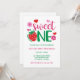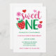 Cette invitation à la fraise sucrée un premier anniversaire présente un graphique qui comprend une fraise, des coeurs et des fleurs.