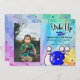 "Amusons-nous", carte d'invitation de fête bleue avec espace pour ajouter la photo personnalisée de l'enfant. Cette invitation est posée sur un fond teinté (bleu) saisissant, utilisant des couleurs vives et tendance. Personnages de dessin animé amusants !