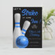 Célébrez dans le style avec cette invitation d'anniversaire vibrante sur le thème du bowling pour garçon ! Avec une boule de bowling bleue brillante roulant vers des quilles blanches et bleues, ce design ludique se démarque sur un fond noir audacieux. Des éclaboussures d'aquarelle bleue douce ajoutent une touche amusante et stylée, apportant de l'énergie et de l'excitation à votre jour spécial.