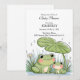 Illustration très émouvante d'une grenouille mère et d'une grenouille-bébé assis ensemble sous un grand tapis de nénuphars, à l'abri des gouttes de pluie qui tombent. Entourées de fleurs et d'herbe, les grenouilles sourient joyeusement, leurs joues roses brillant de joie. Cette jolie scène capte l'amour et la chaleur d'une journée pluvieuse dans la nature.
