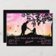 Silhouette romantique d'un couple sous un arbre avec une pleine lune en arrière-plan et quelques papillons. L'arrière-plan est un ciel étoilé, nuageux rose et orange. Idéal pour une annonce de fuite amoureuse ou une fête de fiançailles.