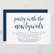 Carton d'invitation de fuite en amoureux à thème bleu marine élégant avec écriture moderne (Célébration de bonheur éternel). C'est parfait pour votre dîner de mariage en fuite en amoureux décontracté au bord du lac, danser et faire la fête.