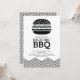 Invitation barbecue noir & blanc moderne et design avec hamburger noir & blanc sur un arrière - plan blanc bordé d'un chevron zigzag. Retournez notre populaire invitation barbecue pour voir un chevron assorti pour une touche spéciale. Invitation amusante pour toutes vos fêtes d'été !