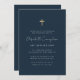Composé de script cursif et de typographie serif; Tout sur un fond d'arrière - plan simple. Une simple croix en faux or décore subtilement la typographie. C'est une invitation funéraire ou commémorative moderne, simple et propre.