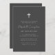 Composé de script cursif et de typographie serif; Tout sur un fond d'arrière - plan simple. Une simple croix en faux or décore subtilement la typographie. C'est une invitation funéraire ou commémorative moderne, simple et propre.