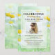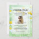 Invitation de souvenir de funérailles avec un doux fond floral de marguerite, une photo de la personne qui n'est plus parmi nous, et un modèle de célébration de la vie facile à personnaliser.