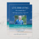 Invitation au souvenir funéraire avec un fond océanique de plage, une photo de la personne, et une célébration bleue de la vie modèle facile à personnaliser.