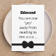 This best man card is funny and unique. The front features the words, "(Name) you are one "yes" away from having to rent a tux ...". On the back side it continues, "... and maybe giving a really short speech. Will you be my best man?" Design and words Copyright Kathy Henis