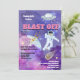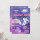 Si vous organisez une fête d'anniversaire sur le thème de l'espace pour votre fille, cette illustration d'un alien vert de dessin animé mignon pilotant un vaisseau spatial UFO à travers une galaxie remplie d'étoiles et de planètes bleues, roses et violettes avec des météores est le design idéal pour votre événement. Les modèles peuvent être personnalisés en fonction de vos besoins et de l'âge de la fille d'anniversaire ajoutés au verso de l'invitation. Ce design est également idéal pour les fêtes pour enfants sur le thème des aliens et de la galaxie.