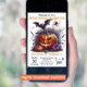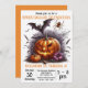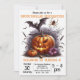 Voici notre invitation de fête d'anniversaire sur le thème d'Halloween personnalisable ! Le design présente un style graphique ludique et effrayant. Le design central met en valeur une citrouille souriante avec des yeux triangulaires et un sourire édenté, flanquée d'une citrouille plus petite et d'une fleur violette. Des chauves-souris en plein vol planent au-dessus de la citrouille, ajoutant à l'atmosphère inquiétante. Le texte est entièrement personnalisable. Si vous cherchez une invitation de fête amusante et sur le thème d'Halloween, celle-ci est parfaite pour vous !