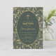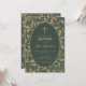 Cette élégante invitation de baptême à l'air vintage, recommandée pour le baptême d'un garçon, comporte un cadre doré vintage avec des feuilles de chardon dorées en spirale et quelques décorations de fleurs de chardon sur fond vert foncé. Le texte est à l'intérieur d'un ovale avec une bordure dorée et comporte une croix dorée au-dessus. Le nom du garçon est écrit dans une élégante écriture calligraphique. Tout le texte peut être personnalisé et a une couleur dorée similaire aux décorations dorées du cadre.