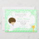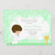 Cette invitation Première Communion en damassé représente un adorable garçon aux cheveux bruns en costume de première communion.