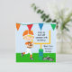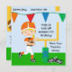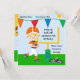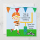 Soyez prêt pour le jour de jeu ! Ces invitations customisées colorées d'anniversaire de thème du football sont grandes pour les garçons qui aiment le football ou ont une célébration de fête d'anniversaire du football ! Drapeaux de caractéristiques, terrain de football, football, chaussures du football, et un garçon dans un casque de football et un jersey oranges tenant un football ! Facile à customiser avec les détails de fête d'anniversaire de votre enfant !