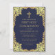 Cette élégante invitation de première communion bleu marine et or avec une atmosphère vintage, recommandée pour un garçon, comporte un cadre en faux or orné de feuilles dorées sur fond bleu marine. Au-dessus du texte, il y a une croix religieuse en faux or. Tout le texte peut être personnalisé et est d'une couleur jaune doré semblable au cadre en faux or.