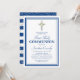 Invitation pour la première communion d'un garçon avec un fond blanc simple pouvant être changé en n'importe quelle couleur, une double bordure bleu marine, une croix religieuse argentée avec des fleurs blanches et un modèle de première communion facile à personnaliser. Le dos présente des rayures nautiques bleues et blanches, et des paillettes argentées.