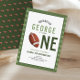 Cette invitation moderne pour le 1er anniversaire d'un enfant présente un design sportif vert, avec un ballon de football mignon faisant le 'UN', et un motif assorti au dos. L'invitation peut être personnalisée avec le nom de votre garçon et d'autres détails nécessaires pour votre fête. L'ajout parfait sur le thème sportif pour la première fête d'anniversaire de votre enfant sur le thème du football américain.