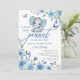 Fêtez l'arrivée prochaine d'un petit garçon sucré avec cette adorable invitation au baby shower sur le thème des éléphants. Ce design charmant est parfait pour un baby shower avec une touche naturelle ou fantaisiste, avec une palette de couleurs bleu poussiéreuse douce avec roses et papillons délicats.