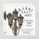 Mardi Gras party invitation featuring a antiqued gas lamp with hanging Mardi Gras beads and mask. Customize this party invitation with all your details. The reverse of this invite features a Mardi Gras mask and beads.
