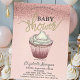 Invitation pour une baby shower avec un fond bokeh pailleté rose gold et un gâteau de bébé. Ces invitations pour une baby shower sont facilement personnalisables pour votre événement en ajoutant simplement vos informations.
