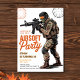 Gear up and get ready for an action-packed Airsoft Party! This high-energy invitation is perfect for celebrating Ethan's 14th birthday. The design features a cool, illustrated soldier in full combat gear, ready for battle, with target graphics in the background to set the scene. It's the perfect way to assemble your squad for a thrilling day of strategy and fun. All the party details are fully customizable to get your recruits ready for the mission!