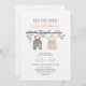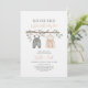 He or She? What will baby be? A cute gender reveal invitation featuring baby boy and baby girl clothes hanging on tree branch.
