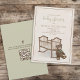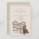 Ce design comprend une invitation classique vintage et neutre pour les femmes, avec un classique rustique vert ours en peluche, avec un site web pour les commerces en ligne avec code QR pour Facebook social media URL page d'événement, un ours en peluche tendance, une typographie de script de calligraphie élégante, une invitation traditionnelle tendance, un lit de berceau vintage berceau berceau, un beige vert brun brun brun, un minima style réaliste, pour une invitation de baby shower neutre pour un garçon ou une fille baby shower dessiné à la main par Laura Lacina.