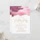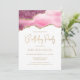 Cette invitation d'anniversaire branchée présente une aquarelle d'une géode d'agate dans les tons roses, égayée avec des reflets de parties scintillant d'or. Les mots "fête d'anniversaire" apparaissent dans la parties scintillant en faux or dans la police décorative moderne d'écriture manuscrite. Customisez-le avec le nom de l'honoré en or art déco police et les détails de la fête en or sans serif type sur un arrière - plan blanc. La même image d'agate rose apparaît à l'envers.