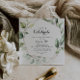 Cet élégant vert or géométrique fêtons l'invitation de la fête est parfait pour une simple fête de fiançailles, la bachelorette, la retraite, la remise des diplômes, mariage après la fête ou tout événement ou fête. Le design est orné de feuilles d'eucalyptus verts peints à la main et ornés d'un cadre géométrique doré.