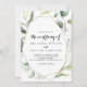 Cette élégante verdure dorée géométrique, le mariage de l'invitation, est parfaite pour un mariage élégant. Le design est orné de feuilles d'eucalyptus verts peints à la main et ornés d'un cadre géométrique doré.