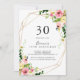 Cette invitation à la fête d'automne tropical d'or géométrique 30e anniversaire est parfait pour une fête d'anniversaire moderne. Le design est composé de pivoines en cascade rose, blush, jaune, bleu et blanc avec des feuilles verts botaniques, ornant un cadre géométrique.