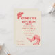 Invitations d'anniversaire avec un texte décoratif rose et rouge "Giddy Up Let's Party", illustration de rose, et bottes de cowgirl rose avec le coeur. L'Arrière - plan est blanc cassé.