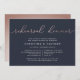 Notre dîner de répétition mariage élégant et moderne ou nos invitations à cocktails comportent un "dîner de répétition" en haut de la page en boucle faux rose feuille d'or typographie manuscrite sur un riche arrière - plan bleu marine. Personnalisez avec votre cérémonie la répétition et les détails du dîner de répétition sous en lettres blanches modernes. Inclut l'espace pour le moment de la répétition et l'adresse de l'église ou du lieu. Un design chic aux couleurs riches pour les couples modernes et les événements élégants.
