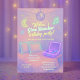Célébrez dans un style éclatant avec cette invitation rêvée d'anniversaire en sommeil doux! Doté d'une palette de néons pastel, ce design comprend une boule de disco, des coussins moelleux et un lecteur de disque brillant, parfait pour les jeunes amateurs de musique qui veulent un sommeil d'anniversaire confortable et élégant. Les tons doux lavande et pêche mélangés à des étoiles brillantes et des notes musicales créent une ambiance amusante et magique. Personnalisez avec vos détails de fête et préparez-vous pour une nuit de jeux, de gâteaux et de airs dansants!