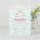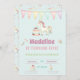 This cute girly unicorn birthday card features a pretty birthday cake and a pretty rainbow unicorn on o turquoise background. The name and age can be changed. The back has a matching pattern with unicorns and candy. Add your RSVP info.