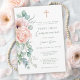 A softly beautiful girl's First Communion Invitation to celebrate this special moment in a child's life, this charming watercolor floral design has pink and peach roses and poppies with lovely trailing eucalyptus greenery along the left border. A matching soft pink cross placed above the text adds a thoughtful Christian element to the invitation. The elegant text template in popular sage green adds freshness and beauty to the overall look and feel of this charming design. This invitation is available in both printed and instant download digital formats for your convenience.