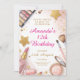 Chic watercolor design featuring gold stars, makeup brushes, lip gloss, and blush tones. Perfect for a glamorous spa or makeup birthday celebration for girls.