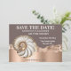 Make a bold and unforgettable first impression with this glamorous coastal save the date design. Featuring a faux gold-edged conch shell with pearly ivory shimmer and pearlised off-white detailing, the composition is set against a luxurious dusky pink jagged backdrop with a soft faux glitter edge that adds a subtle sparkling effect.