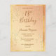 Invitation élégante et glamour pour un 18ème anniversaire. Fond ombré chic de couleur or et or rose avec un simple cadre fin en faux or. Décoré de bulles de champagne festives et d'une paire de verres à champagne. Lettres en or foncé. Le titre : 18ème Anniversaire et le nom est écrit avec des écritures modernes de style lettrage manuscrit.