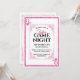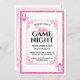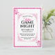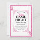Cette séduisante invitation pour la soirée Dames Game Night présente un design de carte de jeu classique sur un arrière - plan blanc. Un cadre de style vintage orné entoure la zone de texte centrale. Un cadre de style de parties scintillant rose correspondant borde l'invitation. Deux coeurs de parties scintillant rose et le monogramme de la reine sont imprimés dans des coins opposés, comme la disposition dans un jeu de cartes. Le mot "dames" est imprimé dans une jolie police de script au-dessus du titre de Game Night.