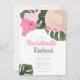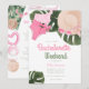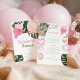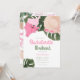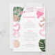 Cette invitation de fête de Bachelorette tendance présente un groupement amusant d'accessoires roses d'été accentués par des feuilles tropicales de monstera. Tous les détails peuvent être modifiés pour répondre aux besoins de votre événement. Le dos présente tous les détails du week-end et est encadré par des accessoires de piscine roses.