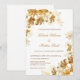 This elegant luxury wedding invitation features 3 dimensional gold flowers and golden line art flowers on a white background. Bride and groom names in an elegant classic script.