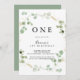 Cette invitation à la fête de premier anniversaire de confetti d'or eucalyptus est parfaite pour une fête d'anniversaire rustique. Le design comprend un feuillage vert d'eucalyptus aquarelle avec des confettis d'or.