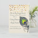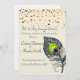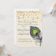 Une belle et rustique décoration à motifs de parchemin avec plumes de paon confetti or accentuent cette élégante invitation de mariage. Invitation personnalisation avec illustration en plumes de paon blanc.