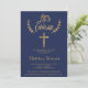 Faux typographie feuille or élégant bleu marine avec confirmation de croix or. Une invitation de baptême moderne avec cette main de brosse en or jaune, moderne, simple, élégant et chic, en lettrage de typographie sur un arrière - plan bleu marine. Parfait pour une soirée simple, élégante et moderne. Si vous avez besoin d'un texte modifié et customisé n'hésitez pas à me contacter!