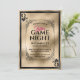 Cette invitation à la soirée Ladies Game Night présente un design classique de carte de jeu sur un motif brillant en feuille d'or. Un cadre de style vintage orné entoure la zone de texte centrale. Un cadre noir borde l'invitation. Deux coeurs noirs et le monogramme de la reine sont imprimés dans des coins opposés, comme dans un jeu de cartes. Le mot "dames" est imprimé dans une jolie police de script au-dessus du titre de Game Night.