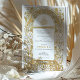 Cette superbe carte à faire-part de mariage islamique exhale l'élégance avec son design d'inspiration Art Nouveau, avec un jeu de couleurs faux or et blanc qui ajoute une touche de luxe et de sophistication. L'avant de l'invitation présente un motif complexe de tourbillons dorés et de fleurs blanches entourant un Bismillah arabe magnifiquement scénarisé dans un style calligraphique. Le dos de la carte conserve la même palette de couleurs pour plus de cohérence, avec une approche minimaliste qui met en évidence le monogramme des initiales du couple. Cette invitation est idéale pour les couples qui souhaitent associer les valeurs islamiques traditionnelles à la beauté intemporelle du design Art Nouveau pour leur mariage.